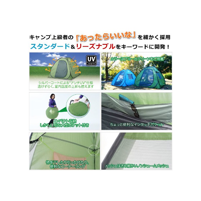 ●재질:(플라이 부분)폴리에스텔(실버 코트)●재질:(플로어 부분)PE●재질:(프레임)스틸 와이어●사이즈:폭172×(길이)깊이172×높이135cm●수납 사이즈:폭60×(길이)깊이60cm●중량:3.8kg●부속품:캐리 백,가이드 로프4개,페그(말뚝)8개●원산국:중국