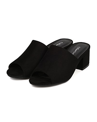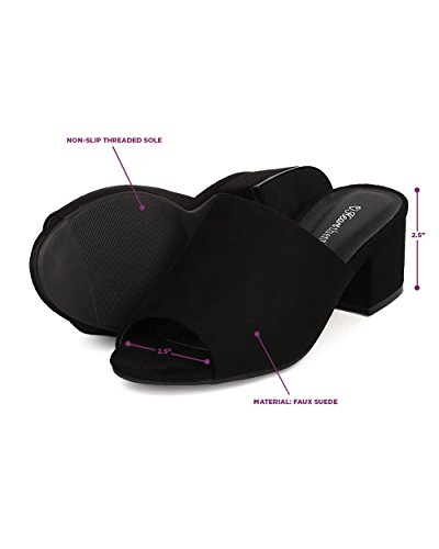 Product DescriptionThese faux suede mules are made with a peep toe, covered vamp, and chunky heel. Also made with an easy to slip on design.0