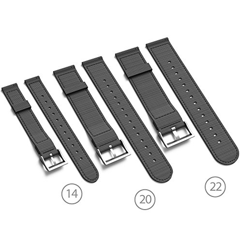 -. Feature : COMPATIBILITY: Our nylon watch bands come in 3 sizes (14mm, 20mm, and 22mm). See the product description below for a list of common compatible watches for each strap size. Be sure to measure the lug width of your watch to determine what band size is approP.R.Iate if your watch is not on the list. NOTE: A few watches are not compatible with quick release pins so make sure your watch is. If it uses a metal sP.R.Ing bar to hold the strap in place it is likely compatible. / QUICK RELEASE PINS: Features quick release pins for fast and easy tool-free installation and removal of straps to change up your look. / DURABILITY AND COMFORT: Watchbands are made with two layers of high quality nylon stitched together for the perfect combination of durability, comfort, and flexibility. / SIZES: Check the product description below for watch band length information (i.e. what wrist sizes each strap will fit) / WARRANTY: Watch bands all come with a 30-day warranty and any defective bands (or parts) will be replaced for free inside of that time frame. Any band that is damaged by a customer (regardless of when it occurs) will be replaced for a $5 fee.