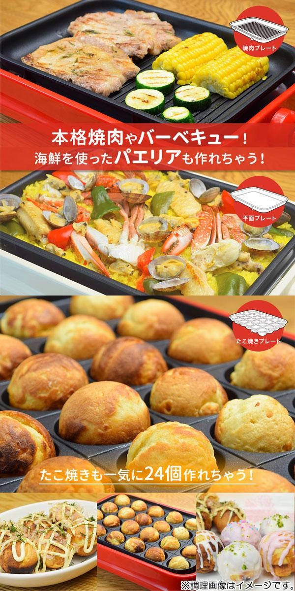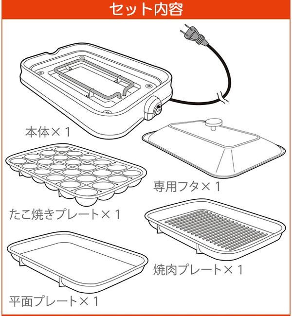 | セット内容 | 本体、専用フタ、たこ焼きプレート(24穴)、焼肉プレート、平面プレート、取扱説明書(保証書:保証期間1年間) |