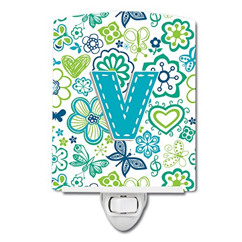 Caroline's Treasures Letter V Flowers and Butterflies Teal Blue Ceramic Night Light, 6 x 4", Multicolor