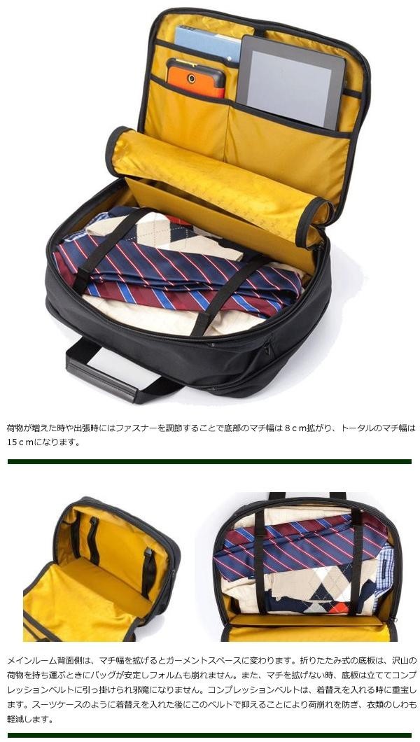 ●商品の特徴● 軽さを優先した上で着替えと書類を分離して収納する点が一番難しかったのですが、このバッグではメインルームを1気室に抑えた上で、出張時に着替えを隠す仕切りをメインルーム内に配置することで問題を解決しました。