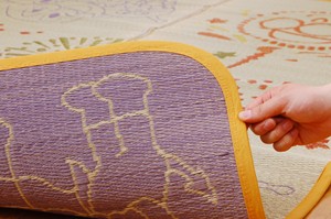 国産(九州産)のい草を使用しています。一本一本が太く、表皮が厚く繊維がキメ細かいので弾力性があり、耐久性に優れています。また使用していくうちに綺麗な黄金色に変化していきます。い草には空気の清浄化作用、湿度の調節作用があり、汚れにくいといった特徴があります。い草に青森ヒバ加工を施しています。(抗菌、防臭効果)。ミシンがけを2重にすることで、ほつれにくく仕上げています。ヘリに麻を15%混合し、綿より丈夫な縁布を使用しています。