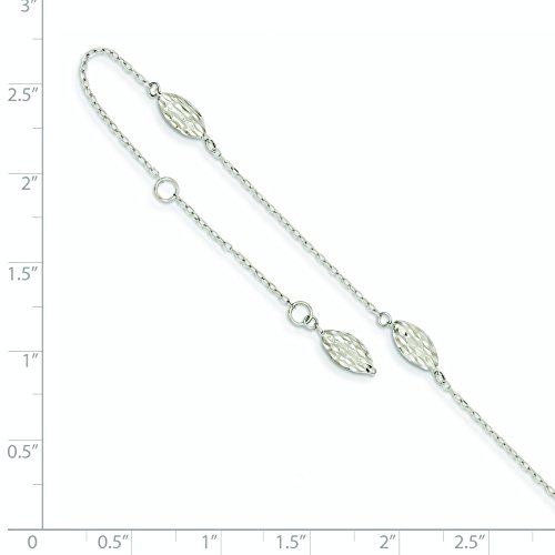 SPECIFICATIONS: Jewelry Type: Anklets, Anklet Type: Anklets with Stations, Material: Primary: Gold, Material: Primary - Color: White, Material: Primary - Purity: 14K, Finish: Polished, Plating: Rhodium, Chain Length: 9 in, Chain Width: 4mm, Clasp /Connector: Spring Ring, Extender Length: 1 in, Feature(1): Adjustable, Texture: Diamond-cut