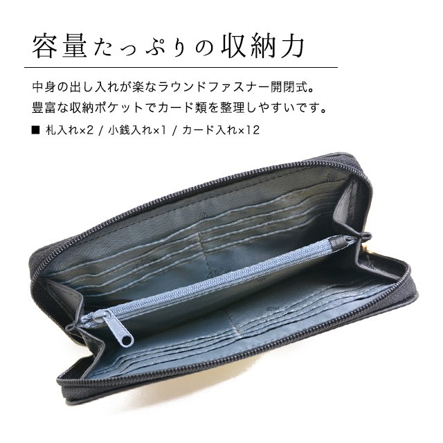| 仕様 | W:19.7cm×H:10.5cm×D:2.5cm 札入れ×2、小銭入れ×1、カード入れ×12 | ||