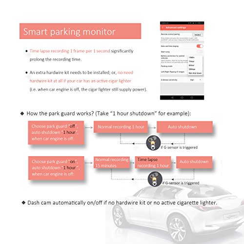 - Intelligent: Super nigh-vision; WDR; Auto loop recording; G-Sensor (Sensitivity adjustable) for auto detection & collision latch; Parking monitor time lapse optional (1 frame/1 second) can significantly prolong recording time (an extra micro USB hardwire kit needed); Digital image stablization; 3D denoising; LDC Geometric correction; Demist; Image adjusting;