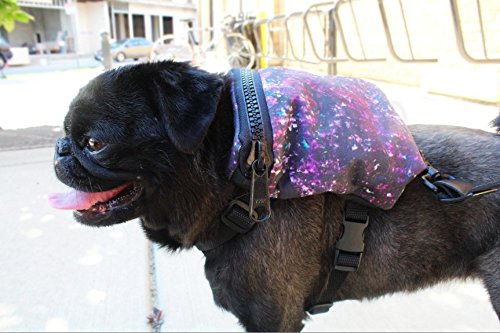 Each dog backpack has the same utility of a harness, with the added bonus of a compartment for extra goodies. No more forgetting anything; instead you'll always be ready for walks, hiking, weekending and adventuring with your beloved pet. Fashionable dog harness backpack designed for the canine adventurer. Pups Who Pack makes bold and edgy lifestyle goods for dogs. As stylish as they are functional, their dog backpacks make everyday outings Instagram-worthy. Pups Who Pack dog pack has been featured in many publications (Dogster, Bustle, Modern Dog, Brit Co, Gotham Magazine and more) and even been seen on celebrity dogs (including Doug the Pug and Gary Fisher). Bag Measurements: 6 1/2" Long x 5 1/2" Wide x 2" Deep Perfect size for everyday use, while maintaining comfort for your dog. A cross between a harness and a backpack, our pack is more of a dog harness with a bonus pouch, making it a perfect poop bag holder and more! Clip your leash to the front or the back of the bag. Side clips make the harness backpack easy to get on and off of your pup. SIZING (see size chart in photos above): XS - Neck: 11" -16" / Chest: 15 1/2" - 19 " / Weight: 10-17lbs Generally fits: Chihuahua, Yorkie, Dachshund, Pomeranian, Pekinese, Shih Tzu, Havanese and more! S - Neck: 13" - 18" / Chest: 17 1/2 "-23 1/2" / Weight: 17-29lbs Generally fits: Pug, Boston Terrier, French Bulldog, Westie, Jack Russell, Corgi, Red Poodle and more! M - Neck: 14 1/2" - 22" / Chest: 20"-27" / Weight: 30 - 50lbs Generally fits: Beagle, Border Collie, Springer Spaniel, Australian Shepherd, English Bulldog and more! Materials: Outside - 100% Printed Polyester Canvas / Lining - 100% Black Cotton Twill / Straps - 100% Nylon Webbing 0 |