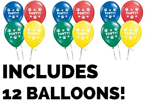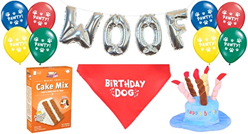 YOUR DOG DESERVES A BIRTHDAY PARTY! Here's what your getting in this kit: ? Birthday Cake Hat - Choose between Pink or Blue on the top right. The hat is made of soft plush material with candles sewn to the hat. Adjustable to fit small to large dogs. ? "Birthday Dog" Bandana - 100% red cotton bandana with "Birthday Dog" printed in white. Adjustable to fit small to large dogs and machine washable. Start a birthday tradition and wear the hat and bandana every year! ? Puppy Cake Wheat-Free Peanut Butter Cake Mix and Frosting for Dogs - all natural, healthy cake and frosting mix. Makes 1 double layer cake, bone cake or cupcakes (even pupcakes!) WARNING: These smell so yummy that humans will want to eat them. Although they are food grade, they are not intended for human consumption ? Pawty 11" Latex Balloons - Helium quality, bold and colorful. Fill them with helium and pass them out to guests as party favors. Assorted primary colors of red, yellow, green and blue with a white paw print design ?"WOOF" Balloon Banner - Stunning metallic silver letter balloons. 12" tall when inflated and easy to manually inflate with provided straw. Includes silver twine for easy stringing. Note: These balloons are air filled only. DO NOT USE HELIUM. They are reusable. ? Satisfaction guaranteed! 0