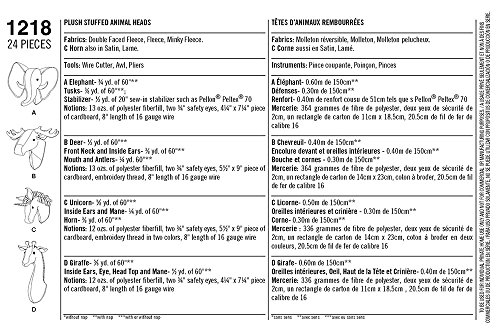 -. Binding : Misc. -. Brand : Simplicity Creative Patterns -. Color : off white -. EAN : 0039363512189 -. Feature : Instructions are written in English, French and Spanish / Made in the USA / Available in sizes: OS (one size) -. IsAutographed : 0 -. Label : OUTLOOK GROUP CORP -. Manufacturer : OUTLOOK GROUP CORP -. Model : 1218 -. MPN : US1218OS -. PackageQuantity : 1 -. PartNumber : US1218OS -. ProductGroup : Art and Craft Supply -. ProductTypeName : HOME -. Publisher : OUTLOOK GROUP CORP -. ReleaseDate : 2015-01-31 -. Size : OS (ONE SIZE) -. Studio : OUTLOOK GROUP CORP -. Title : Simplicity Creative Patterns 1218 Plush Stuffed Animal Heads, OS (ONE SIZE) -. UPC : 039363512189