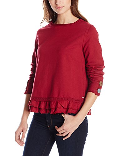 This French terry pullover has it all. Feminine flattering ruffles with novelty cotton lace detail