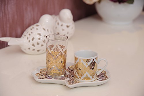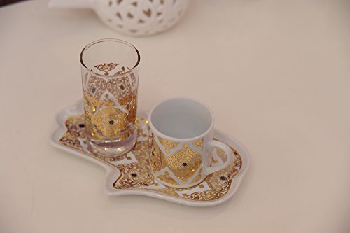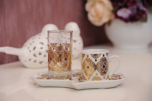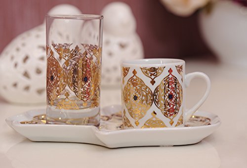 Product Description Decorated Turkish Greek Coffee Espresso Serving Set. Porcelain Demitasse Cup (2 Oz), Water Glass (2.5 Oz) Porcelain Tray Excellent for serving coffee espresso for guests. Hand size tray is easy to hold in hand. 0
