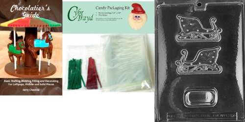 Cybrtrayd Small Sleigh Pour Box Chocolate Mold with Chocolatier's Bundle of 50 Cello Bags, 25 Green and 25 Red Twist Ties and Chocolatier's Guide