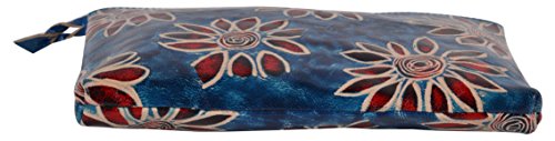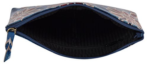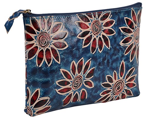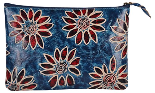 SAAGA Hand Painted Leather Makeup Pouch Cosmetics Bag Makeup Organizer Travel Bag Toiletry Kit with Blue Floral Design / Handmade : 8x5.25 inches (LxB)