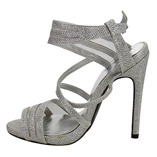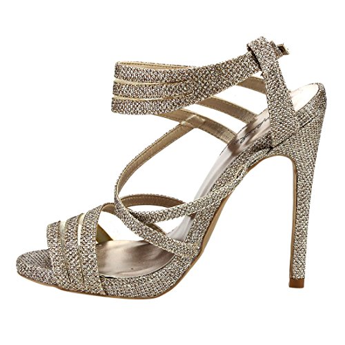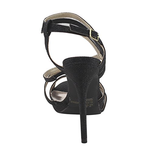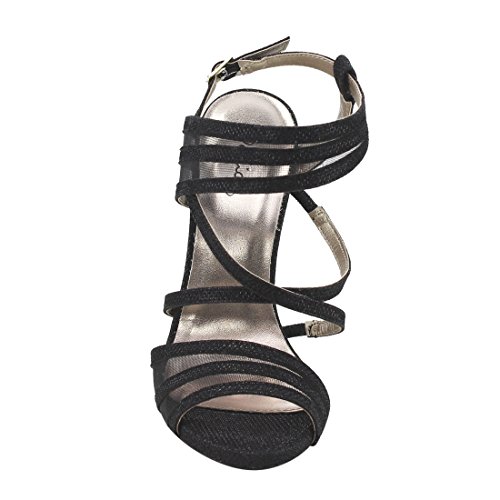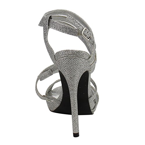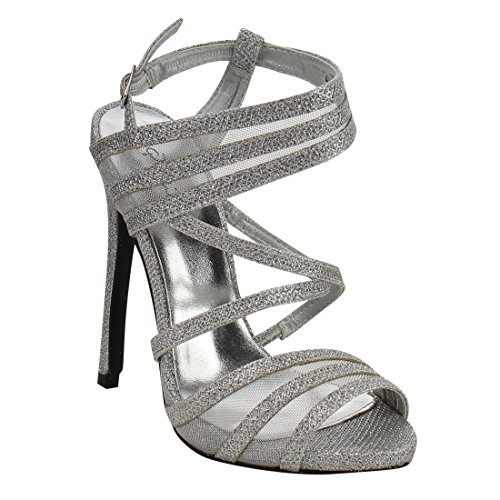 Product Description The elegant sophistication of these slingback sandals complement your evening wear flawlessly. Designed with sparkling upper, strappy silhouette, peep toe front, criss cross strap and covered stiletto heel. 0