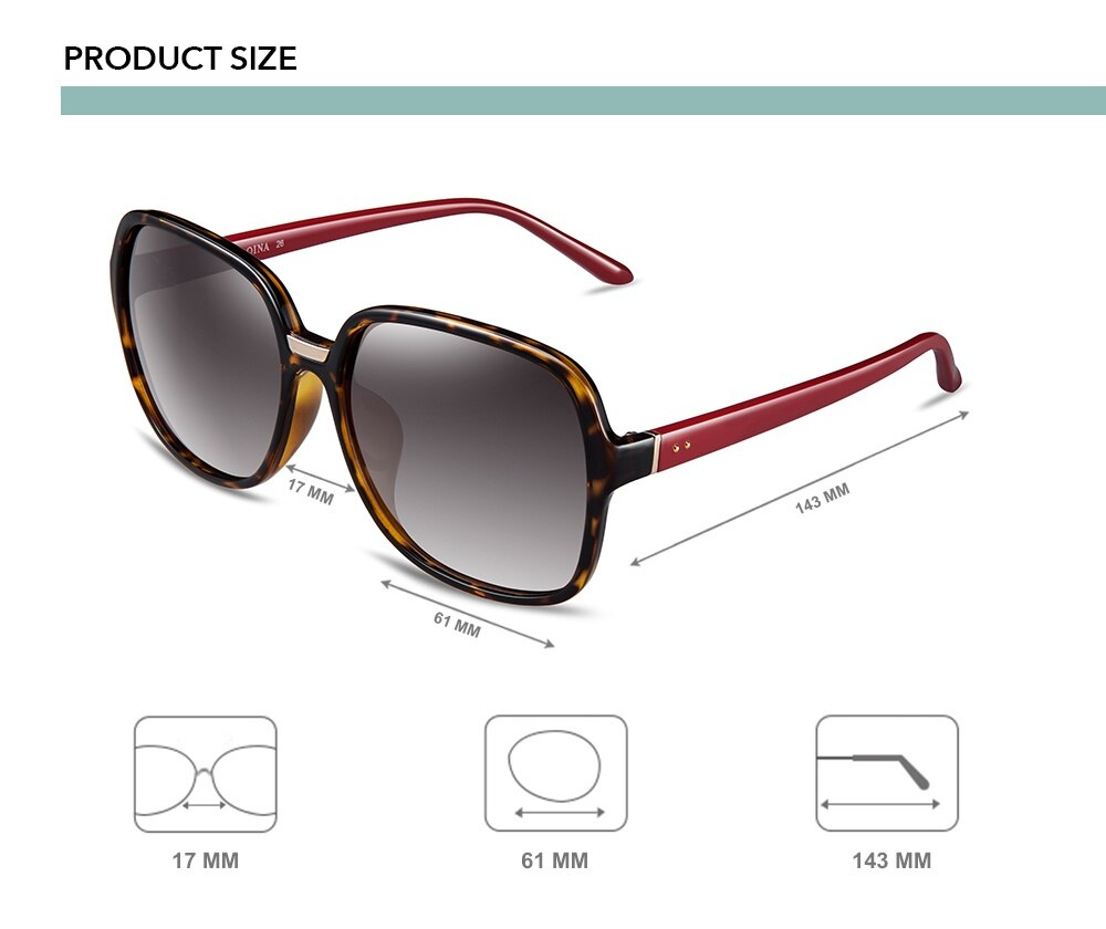 The OVERSIZE sunglasses by QINA might be the most design of this year .Built for being chic, this unique sunglasses feature lightweight TORTOISE frames and a GREY color POLARIZED lenses, come with an anti reflective coating & UV 400 protection to preserve your eyes from the sun. Comes with a FREE colorful premium and unique designer bag & a cleaning cloth.