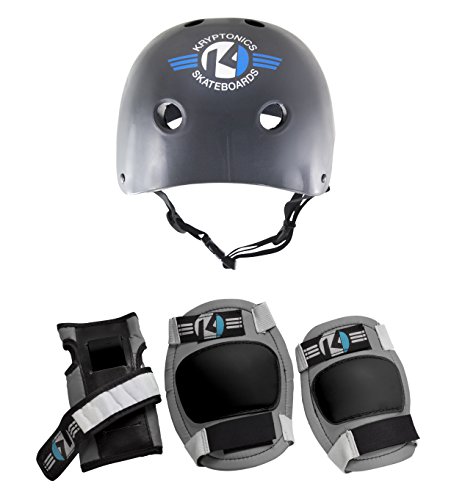 -. Binding : Sports -. Brand : Kryptonics -. Color : Grey -. EAN : 0085955093567 -. Feature : Protective 4-item set that includes knee, elbow, and wrist pads as well as a helmet for children / Injection molded plastic pads with polyester fabric provide shock dissipation and softens impact of falls / Pads are easy to take on and off with elasticized nylon straps and high impact buckles, and wick away moisture for superior comfort / Helmet contains absorbing foam liner and high-impact outer shell for added protection / Recommended for ages 5-9 years - helmet fits head circumference of 20-22 in. -. Label : Bravo Sports -. Manufacturer : Bravo Sports -. Model : 160425 -. MPN : 160425 -. PackageQuantity : 1 -. PartNumber : 160425 -. ProductGroup : Sports -. ProductTypeName : OUTDOOR_RECREATION_PRODUCT -. Publisher : Bravo Sports -. Studio : Bravo Sports -. Title : Kryptonics Starter 4-in-1 Pad Set with Helmet - Small/Medium -. UPC : 085955093567 -. Warranty : 90 Days