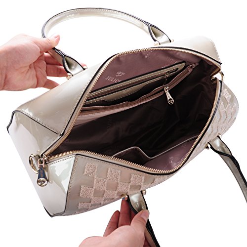 -. Brand : JULICE -. Department : womens -. Feature : Fashion and unique design / High quality PU leather material / Adjustable shoulder straps / Approximate Dimensions:(L)12.2" x (H)8.66"x (W)6.29"and Handle Height:6.1" / Please Note that slight color difference should be acceptable due to the light -. ProductGroup : Shoes -. ProductTypeName : HANDBAG -. Title : JULICE Women Quilted Satchel Fashion Winter Handbag