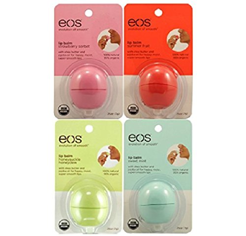 Studio : EOS Publisher : EOS Binding : Health and Beauty Product Description Can a lip balm make you smile? We think so. Thats why we invented this one. eos lip balm is 95% organic, 100% natural, and paraben and petrolatum free. Packed with antioxidant-rich vitamin E, soothing shea butter and jojoba oil, eos keeps your lips moist, soft and sensationally smooth. Directions: Twist off top. Pucker up. Smooth on. Smile. Flavors include Summer Fruit, Sweet Mint, Strawberry Sorbet, Honeysuckle Honeydew 0