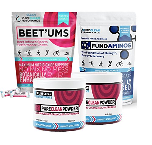 Product DescriptionPureClean Powder - 2 Pack, Organic Beet powder (Jar 300G), PLUS FundAminos - Delicious, VEGAN amino acid supplement AND Beet'Ums - beet infused Chocolate Pomegranate Chews for athletic performance.0