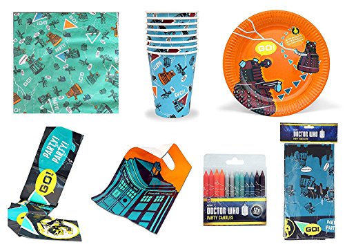-. Feature : Officially BBC Licensed Products / The complete party pack / Includes: 16 x 2 ply napkins, 8 x 255ml paper cups, 6 x 23cm plates 6 x Party Bags / Large 180cm Plastic Tablecloth, 198cm Party Banner, 12 Candles / A must have for a Doctor Who Fan