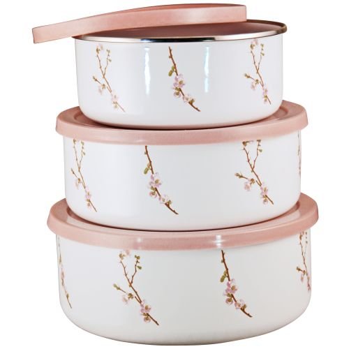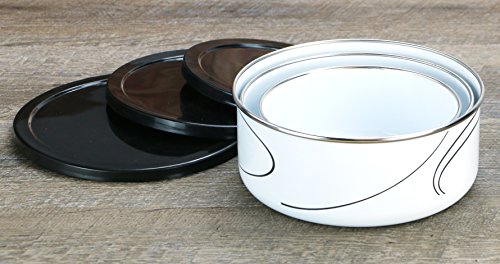 Reston Lloyd is a leading manufacturer and distributor of kitchenware, specializing in enamel on steel products. For nearly 30 years, they have been dedicated to providing the highest quality products, with an equal emphasis on superior customer service. Reston Lloyd provides a wide variety of household goods that coordinate with patterns of popular dinnerware manufacturers. The 6-piece bowl set comes with three heavy gauge steel bowls and matching BPA free plastic lids. Each bowl features a stainless steel rim with your favorite Corelle pattern on the outside of the bowl as well as a clean white enamel interior finish. Bowls measure 3 cups, 5.75"D x 2.25"H, 5 cups, 6.5"D x 2.5"H, 7 cups, 7.25"D x 2.75"H. Each set nests together with lids to minimalize storage space. Great for storing food in your refrigerator or freezer. Hand wash recommended, not recommended for microwave.Feature