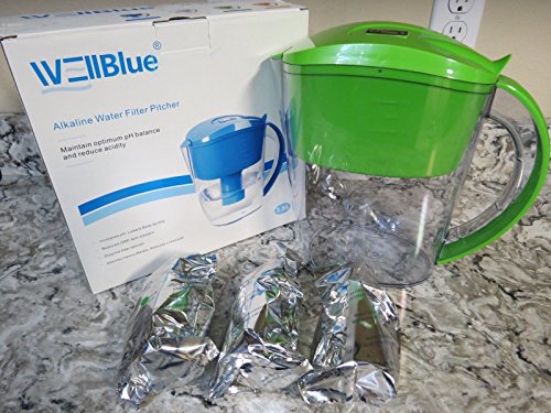 -. Binding : Kitchen -. Brand : Well Blue -. Color : Blue -. Feature : Active Carbon, Ion-Exchange Resin, ORP ion ceramic ball, magnesium ion ball / Convert regular tap water into ionized water. / A digital indicator which can remind you to replace the cartridge in time. / One (1) filter is good up to 2 months or more. -. IsAutographed : 0 -. Label : Well Blue -. Manufacturer : Well Blue -. ProductGroup : Home -. ProductTypeName : HOME -. Publisher : Well Blue -. Studio : Well Blue -. Title : Wellblue Alkaline Water Filter Pitcher