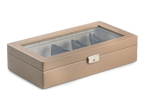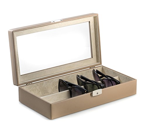 Product Description Our distinctive taupe leather eyeglass case holds your favorite "specs" in style! The glass lid allows you to view your collection and ponder which one you will wear next. Velour lined case. Locking Clasp. Measures approximately 14.5"L x 7.5"D x 3.5"H 0