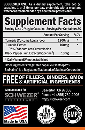 SUPERIOR QUALITY TURMERIC CAPSULES ENHANCED WITH BIOPERINE: Schwezer turmeric formula has 1300mg of Turmeric Curcumin with 95% Standardized Curcuminoids and 10mg of BioPerine (black pepper, curcumin with black pepper) for enhanced absorption and bio-availability.
