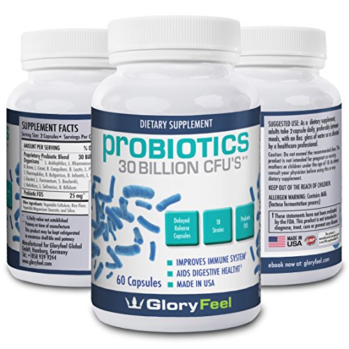 Gloryfeel a leader in Probiotic Supplements is proud to offer you our 60 count Probiotic for Men and Probiotics for Women including Prebiotic FOS. Developed in Germany and manufactured in the United States our 30 Billion CFU probiotic combines the maximum amount of digestive and immune support available today with cutting edge science and manufacturing techniques. The patented new delayed release capsules allow the bacteria to remain alive through to the intestines. Developed in Germany by a world class team of nutritional experts our delayed release probiotic tablets are then manufactured in the United States in an FDA approved and GMP certified facility. Our Probiotics are known to support the digestive system while aiding your body's immune system and ability to process nutrients and minerals. Gloryfeel's probiotic bacterias are a natural and safe reproduction of the "good" bacterias that naturally exist in the human body. This means that you are never ingesting any bacteria into your system that doesn't already exist in your digestive system. Our probiotics are simply supplementing the amount of good bacteria in your body allowing you to more easily digest foods, process nutrients, and boost the immune system. An ideal aid for the treatment of: irritable bowel syndrome, Inflammatory bowel disease (IBD), Infectious diarrhea caused by viruses or parasites, as well as a host of digestive conditions including constipation and bloating. At Gloryfeel we stand by each and every bottle of probiotic supplements that we manufacture. Developing a relationship of mutual trust is important to us. All of our ingredients are clearly labeled and 100% accurate. If at any time you are not 100% satisfied with your purchase feel free to return it to us for a full and prompt refund. At Gloryfeel we are delighted to answer any questions that you may have about our products, if at any time you would like additional information feel free to contact us.Feature