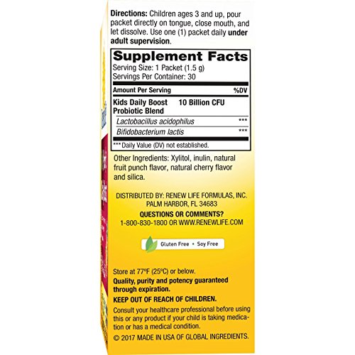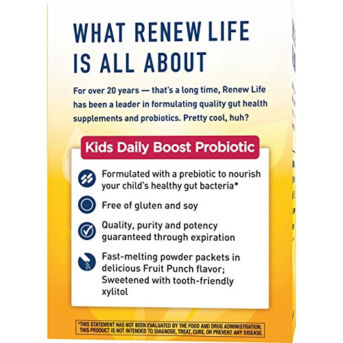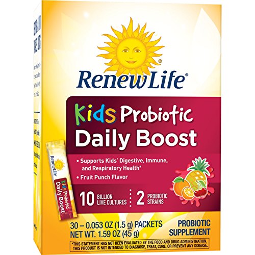 Daily Boost is a probiotic supplement from Renew Life that provides everyday support for your child's digestive, immune, and respiratory health. In a delicious and convenient fast-melting form, these tasty powder sticks are packed with fruit punch flavor. Made with 10 billion guaranteed live cultures per serving from two Bifidobacteria and Lactobacilli strains, Daily Boost reflects your child's natural gut diversity and supports their immune health. These statements have not been evaluated by the Food and Drug Administration. This product is not intended to diagnose, treat, cure, or prevent and disease.Feature