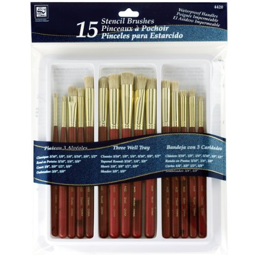 LOEW-CORNELL: Stencil Brush Set. This set of stencil brushes has everything you could need! This package contains fifteen total brushes; including: classics 3/16 inch; 1/4 inch; 5/16 inch; 3/8 inch; 1/2 inch; tapered rounds 3/16 inch; 1/4 inch; 3/8 inch; short 1/4 inch; 3/8 inch; 1/2 inch; 5/8 inch and shader 3/8 inch; 5/8 inch. Imported.