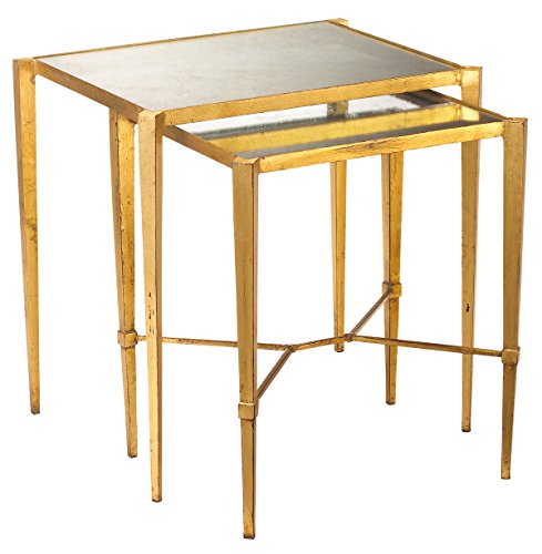 -. Feature : 22 inches high x 22.5 inches wide x 17 inches deep / Constructed from wrought iron and mirrored glass / Finished in gold leaf / Antique mirrored top / Set includes (2) tables