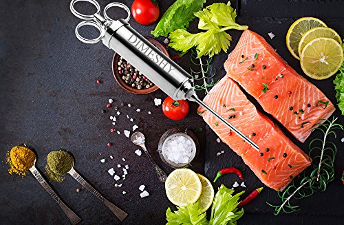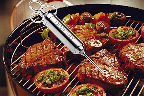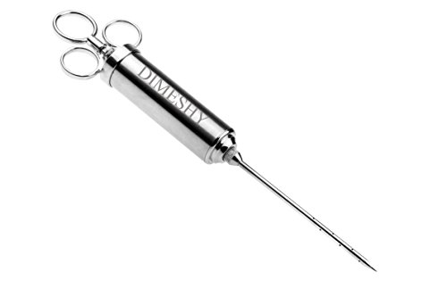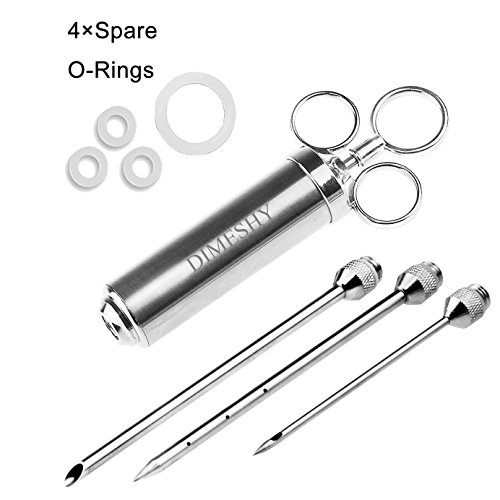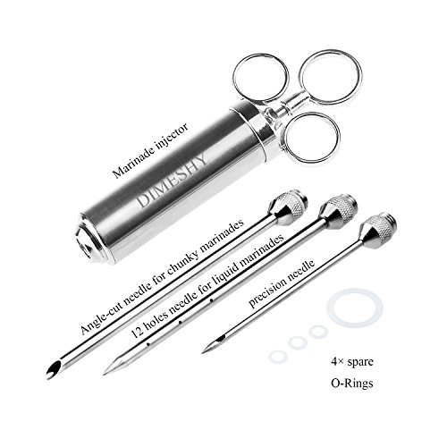 - PROFESSIONAL QUALITY: DIMESHY meat injector is made of 304 stainless steel and with three ring handle, that give you a better grip. Healthy and safe, no rust, no corrode, no bend or break, you can easy puncture the meat with this marinade injector without blocking.