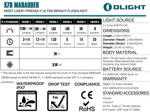 - SUPER BRIGHT 12,000 LUMENS - 33% brighter than the original X7, the X7R Marauder features a 3x CREE XHP70 LEDs for an incredible 12,000 lumen output and 415 yard throw