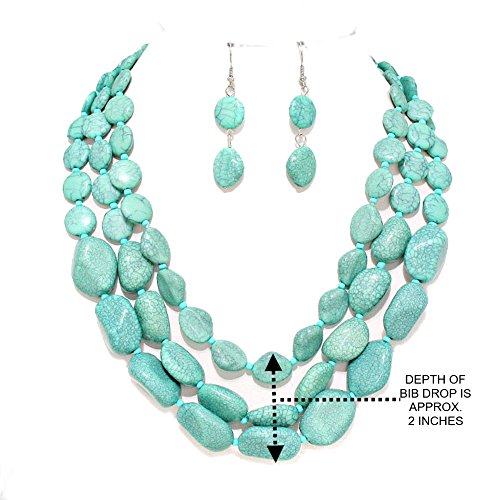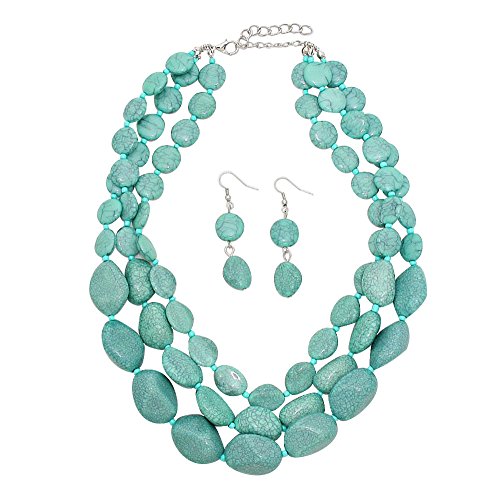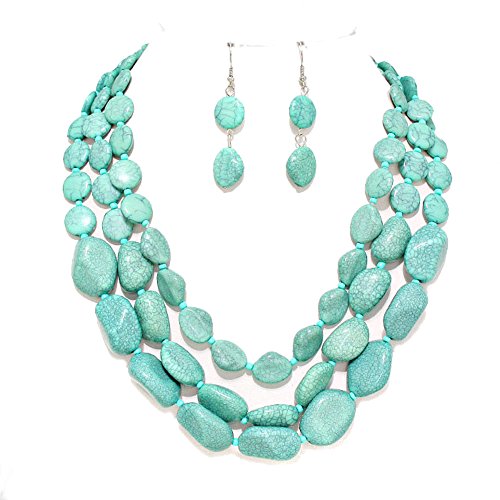 -. Binding : Jewelry -. Brand : Passion -. Department : womens -. Feature : 16 inch three strand teal color marbled finish, stone-shaped bead necklace with 4 inch extender. / Largest beads measure approximately ¾ by 1 inch; smaller, round shaped beads are ½ inch in diameter. / Depth of drop on the bib portion of the necklace is approximately 2 inches. Necklace closes with a lobster clasp. / Matching dangle drop earrings are 2 1/8 inches in length as measured from the top of the ear wire and ½ inch at their widest point. / All silver-tone findings. -. ProductGroup : Jewelry -. ProductTypeName : FASHIONOTHER -. Title : Triple Strand Marbled-Finish Stone-Shaped Teal Bead Necklace 16” with 4” Extender and Dangle Drop Earrings
