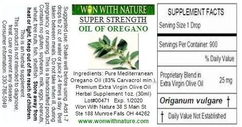 -. Binding : Health and Beauty -. Brand : Won With Nature -. EAN : 0687077575138 -. Feature : Turkish Oregano Oil, 83% Carvacrol (minimum) / Premium Extra Virgin Olive Oil / Convenient 1oz. size bottle / Approx. 900+ drops per bottle / Normal Healthy Immune Support -. Label : Won With Nature -. Manufacturer : Won With Nature -. PackageQuantity : 1 -. ProductGroup : Health and Beauty -. ProductTypeName : HEALTH_PERSONAL_CARE -. Publisher : Won With Nature -. Studio : Won With Nature -. Title : Won With Nature Super Strength Oil of Oregano -. UPC : 687077575138