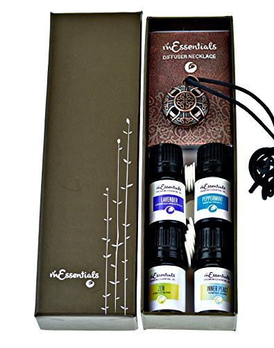 -. Feature : ? UNIQUE - wonderful aromatherapy Essential oils and Diffuser Necklace Gift set for you or to give as a gift. Combines beautifully crafted Diffuser necklace with four 5 ml bottles of 100% pure therapuetic grade essential oils, and ten refill pads packaged in a finely crafted gift box. / ? EASY TO USE - Open locket, add oil to pad, close chamber and enjoy the scent as it is released throughout the day or evening / ? PREMIUM ESSENTIAL OILS - Enjoy 100% Pure Therapeutic Premium Grade Lavender, Peppermint, Zen (blend of Lavender, Orange, Patchouli, Jasmin and Bergamot) and Inner Peace (Blend of Geranium, Clove Bud, Patchouli,Lavender, Orange). / ? GREAT GIFT - All in one Aromatherapy on the go to gift yourself or your love ones / ? VALUE - Get the complete gift set for a great P.R.Ice!