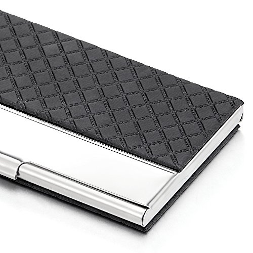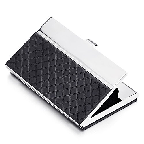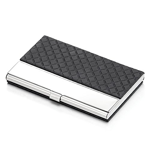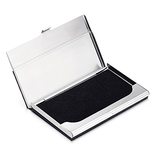 Product Description *Material: Stainless Steel and Leather; Color: Silver and Black *Measures: 3.70x2.32x0.39inch *Ideal for business cards, credit cards and ID cards; Holds 10-15 business cards *Slim and thin. Perfect to slip into your pocket, briefcase or handbags *Timeless style for both men and women