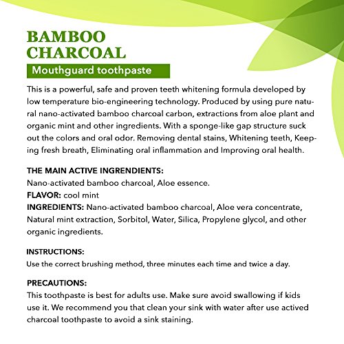 - SAFE & ALL NATURAL: Product combines nano-activated bamboo charcoal, aloe essence and other all natural ingredients, deliver a powerful but safe teeth whitening formula without harmful effervescent or abrasive ingredients.