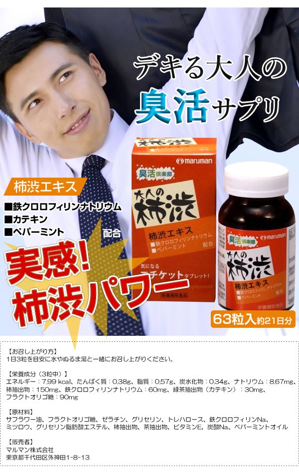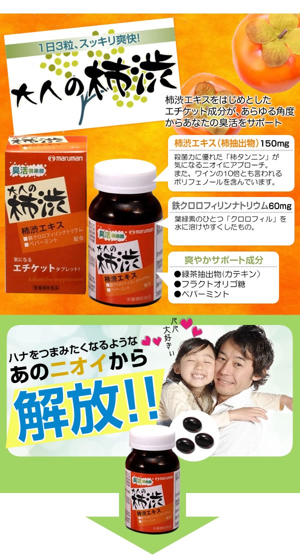 | 最近なんだか枕が臭う!?「大人の柿渋」はそんな自分のにおいに敏感な方のエチケットサプリ。柿渋エキス・鉄クロロフィリンナトリウム・カテキンなどのエチケット成分があなたの臭活をサポートします。 |