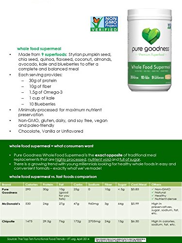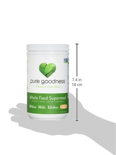 Pure Goodness Super meal is made from 9 superfoods such as pumpkin seeds, flax seeds, quinoa, chia seeds, coconut, almond, kale, avocado and pomegranates! Just one serving of the Whole Food Supermeal contains six eggs worth of protein, two apples worth of fiber, one portion of salmon worth of omegas, 2000 ARAC worth of antioxidants and one cup of kale worth of greens. Each serving provides 30 g of protein, 10 g of fiber, and 1.5 g of Omega 3! Minimally processed, nutrient full and sugar free, Supermeal is the healthy alternative to traditional meal replacements! Plus, it is completely plant-based, vegan friendly, NON GMO verified, made with Gluten Free ingredients, soy free and dairy free. We believe in wholesome nutrition for everyone therefore at Pure Goodness for every product purchased we provide one meal to a child in need in our hopes to fight child hunger and give goodness!Feature
