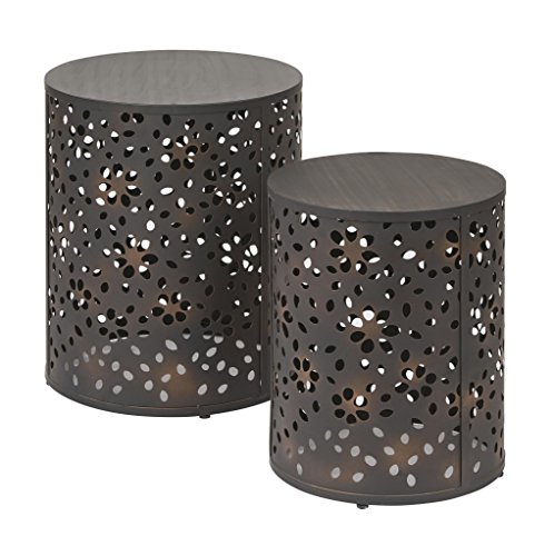 -. Feature : Rustic metal finish. Includes small accent table. Fully assembled. Intended for Residential Use Only. / Large Overall Size: 16.75"W x 16.75"D x 21"H, Small Overall Size: 14"W x 14"D x 18"H / Outer Materials: Metal, PVC FEET. Assembled Dimensions: 16.75"D x 16.75"W x 21"H / Assembled Net Weight: 20 lbs. Weight Capacity: 20 lbs. Color: Antique Bronze. / Warranty: OSPD. Country Of Origin: China.