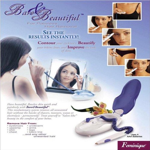 Studio : BARE BEAUTIFUL Publisher : BARE BEAUTIFUL Product Description Have beautiful flawless skin quick and painlessly with "Bare Beautiful". This revolutionary hair removal system removes all unwanted hair without the hassles of shavers, tweezers, waxes or electrolysis. Contour your eyebrows, beautify your bikini lines and improve the look of your skin. See the results instantly! Sculpt and shape your eyebrows, remove unwanted hair from you upper lip and chin or remove unsightly hair hair from your under arms, legs, chest and bikini line. Painless and effective. Each uses 4 AAA Batteries (not included) 0
