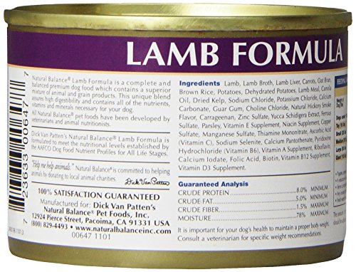 -. Binding : Misc. -. Brand : Dick Van Patten's Natural Balance® -. EAN : 0723633006477 -. Feature : Complete and balanced for all breeds and life stages from puppies to adults / Contains all the nutrients, vitamins and minerals necessary for your dog / Contains no artificial preservatives, flavors, colors or bleached ingredients -. Label : Natural Balance -. Manufacturer : Natural Balance -. Model : NB43647 -. MPN : NB43647 -. PackageQuantity : 1 -. PartNumber : NB43647 -. ProductGroup : Pet Products -. ProductTypeName : PET_SUPPLIES -. Publisher : Natural Balance -. Size : 6 Oz. -. Studio : Natural Balance -. Title : Natural Balance Ultra Premium Lamb Canned Dog Formula, Case of 12 Cans/6 Oz -. UPC : 723633006477