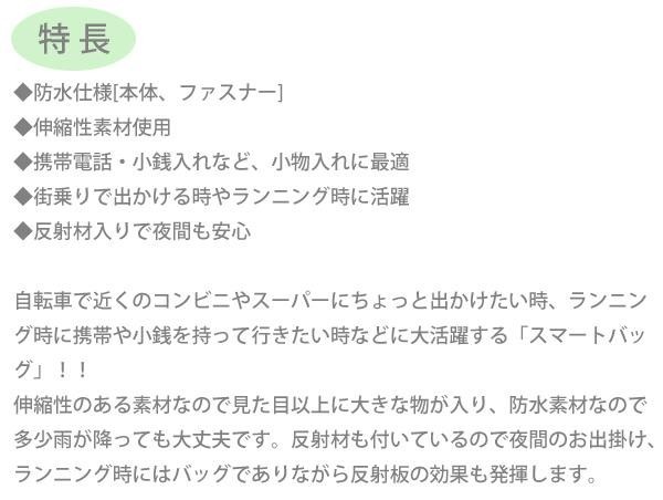自転車で近くのコンビニやスーパーにちょっと出かけたい時、ランニング時に携帯や小銭を持って行きたい時などに大活躍する「スマートバッグ」です。伸縮性のある素材なので見た目以上に大きな物が入り、防水素材なので多少雨が降っても大丈夫です。反射材も付いているので夜間のお出掛け、ランニング時にはバッグでありながら反射板の効果も発揮します。3色からお選びください。 |