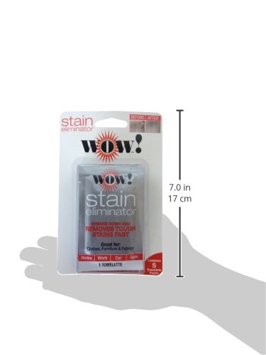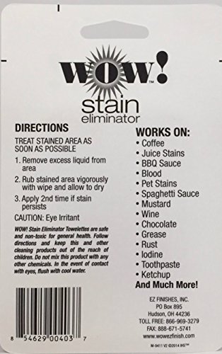 Studio : EZ FINISHES, INC. Publisher : EZ FINISHES, INC. Binding : Health and Beauty Product Description Wow! stain eliminator are safe, non-toxic portable wipes that can be used to remove stains on the go. This allows for stain removal with no need to spend the whole day with an embarrassing stain or to change clothes. They are perfect to carry in purse for spills and spots, to stash some in your desk for the latest crisis, put them in your brief case for pre-meeting touch ups or keep them in your car for spills and quick clean up. 0