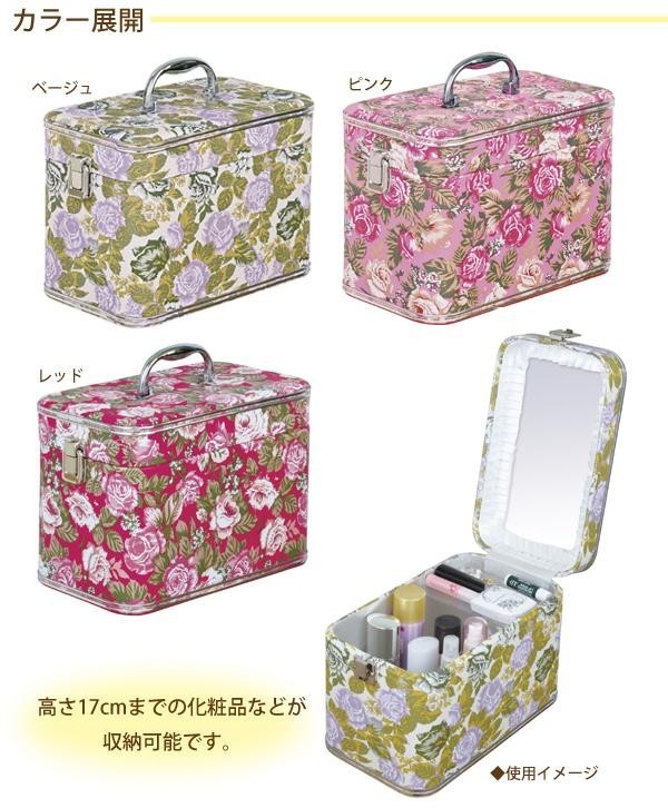 fk094igrjsゴージャスなバラ模様により華やいだ色合いをベースにした新しいシリーズです。 製造国:中国 素材・材質:フェイクレザー(PVC)ポリエステルポリスチレン 商品サイズ:17.5×31×27cm 仕様:ミラー・トレー付高さ17cmまで収納可※お届け地域により、別途運賃がかかる場合やお届けできない場合がございますので、お問い合わせ下さい。