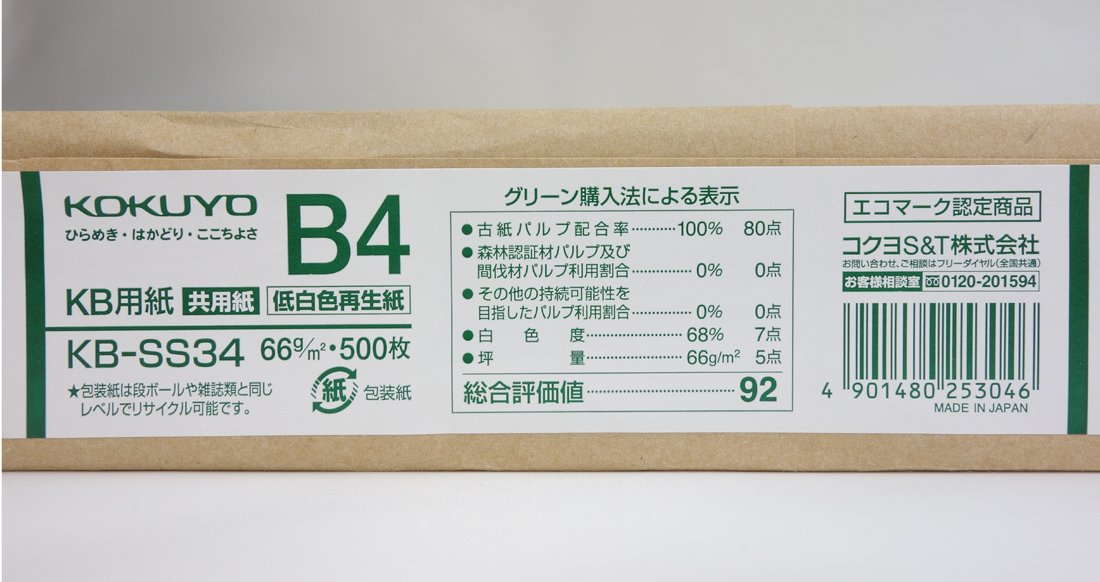 100% Kokuyo KB low white paper recycled paper 66g B4 500 pieces of KB-SS34 (japan import)