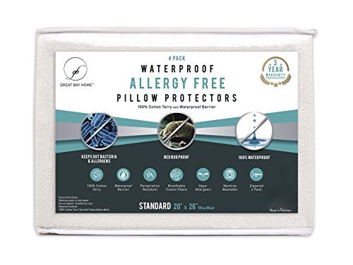 Studio : Great Bay Home Publisher : Great Bay Home Product Description 4-Pack Premium 100% Waterproof Allergy Pillow Protectors These 100% waterproof pillow covers effectively block dust mites, bed bugs, pet dander, pollen, bacteria and other pests and allergens while also protecting your pillows from saliva, perspiration, liquids, stains and basic wear and tear. They're a must-have if you suffer from nighttime allergies!