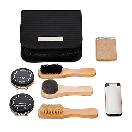 How to Shine and Care for Your Shoes: Step 1- Remove the laces from your shoes before starting to polish them. Step 2- Clean the dirt and debris from your shoes. Debris can be embedded in leather if it is not cleaned off prior to polishing. For best results, it is recommended to clean your shoes with a cleaning wipe or damp rag and allow them to dry before applying polish. Step 3- If your shoes are dry cracked, apply a leather conditioner (not included). Just as your own skin can crack and become dry, so can leather. Apply the conditioner with a clean cotton cloth and allow the shoes to completely dry before proceeding to the next step. Step 4- Apply polish evenly to the entire body of the shoe. A thin layer of polish will do it, but you need to make sure that it is evenly applied to avoid spotting on the leather. Let the polish dry before proceeding to the next step. Shoe polish should be applied with a clean cotton rag or the foam applicator. Use the smaller brush to rub polish deep into the area between the heel shoe uppers. Step 5- Buff your shoes until they shine: First use the large brush; then use the buffing cloth in a brisk side to side motion for the final shine.
